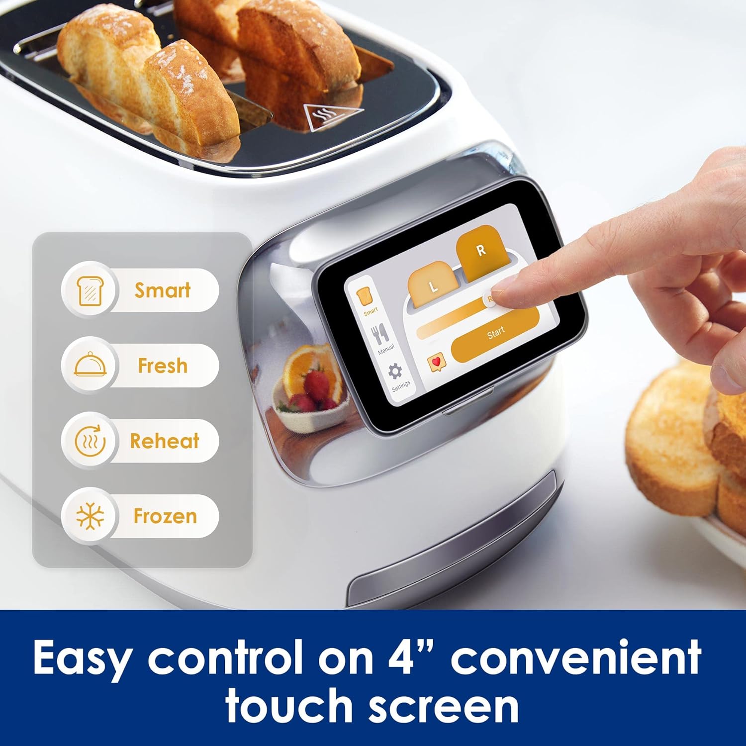 - 4” THOUGHTFUL LCD TOUCHSCREEN – Simply see, slide and select to choose the exact color you want for your toast – and what you pick is what you get! The smart toaster offers 4 toasting modes: Smart, Fresh, Reheat, Frozen.